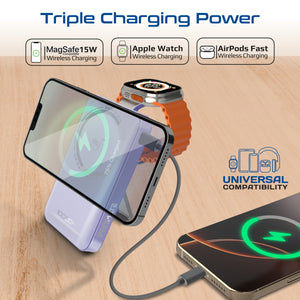 3-in-1 Wireless Charging: Charge your iPhone, Apple Watch, and one USB-C device simultaneously with seamless wireless and wired options in one sleek power bank.