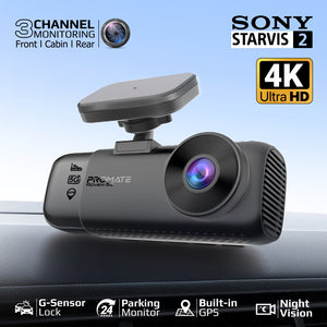 4K Ultra HD 3-channel dash cam with Sony Starvis 2 night vision, built-in GPS, dual-band WiFi, parking mode, and G-sensor for impact detection. Features a 3.16” IPS screen and supports up to 512GB storage for complete road coverage.