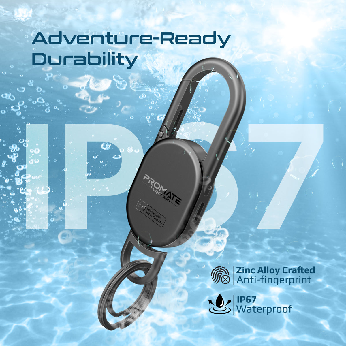 Promate Smart Carabiner Keychain with Apple Find My, 90dB Alarm, Rechargeable Battery, Bluetooth 5.2 Tracker, IP67 Waterproof, Compact Locator for Bags, Pets, Keys, Luggage, 3-Month Standby
